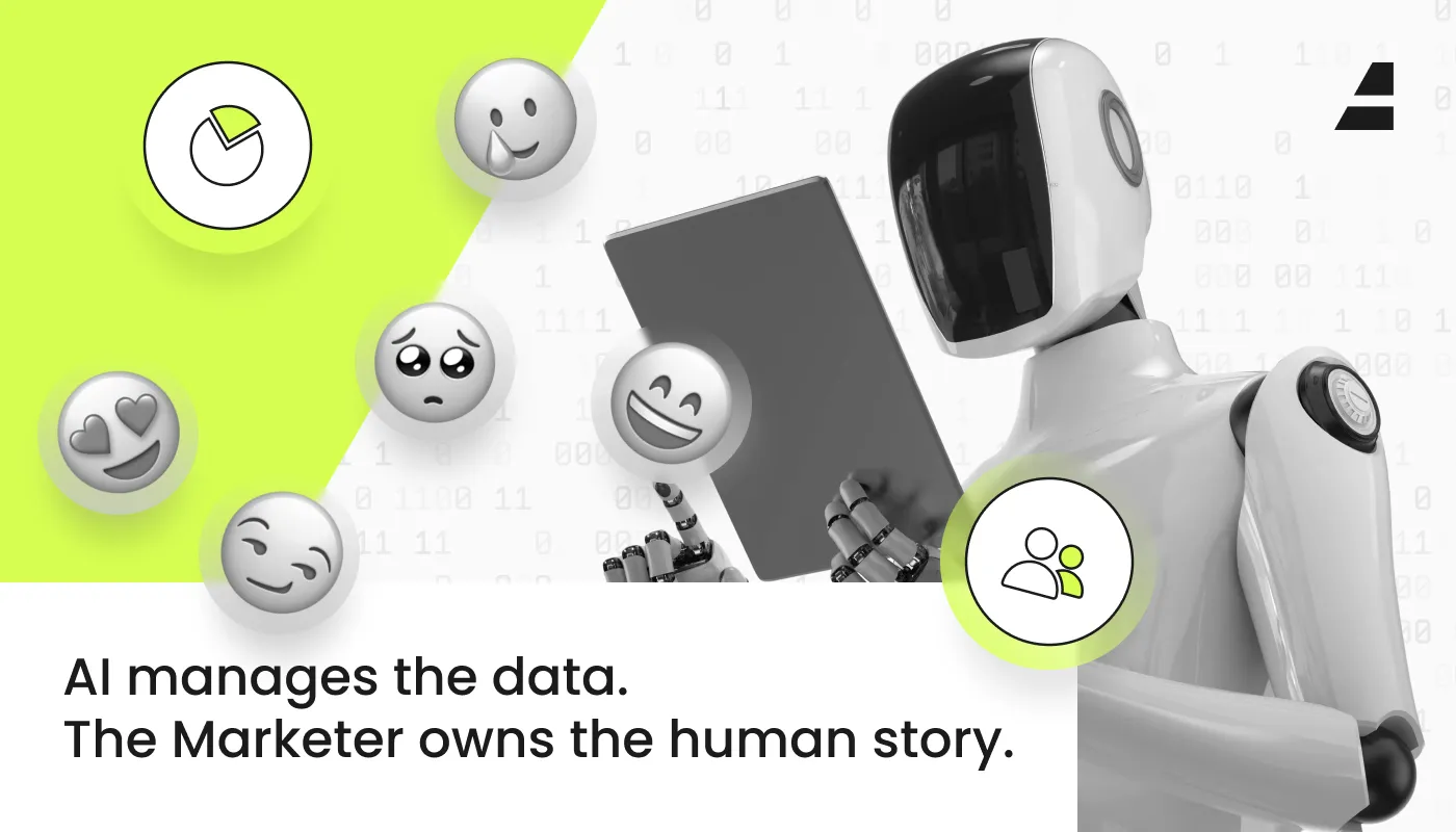 AI manages the data; the marketer owns the human story. Illustrates the collaboration between AI analytics and human creative direction/empathy.