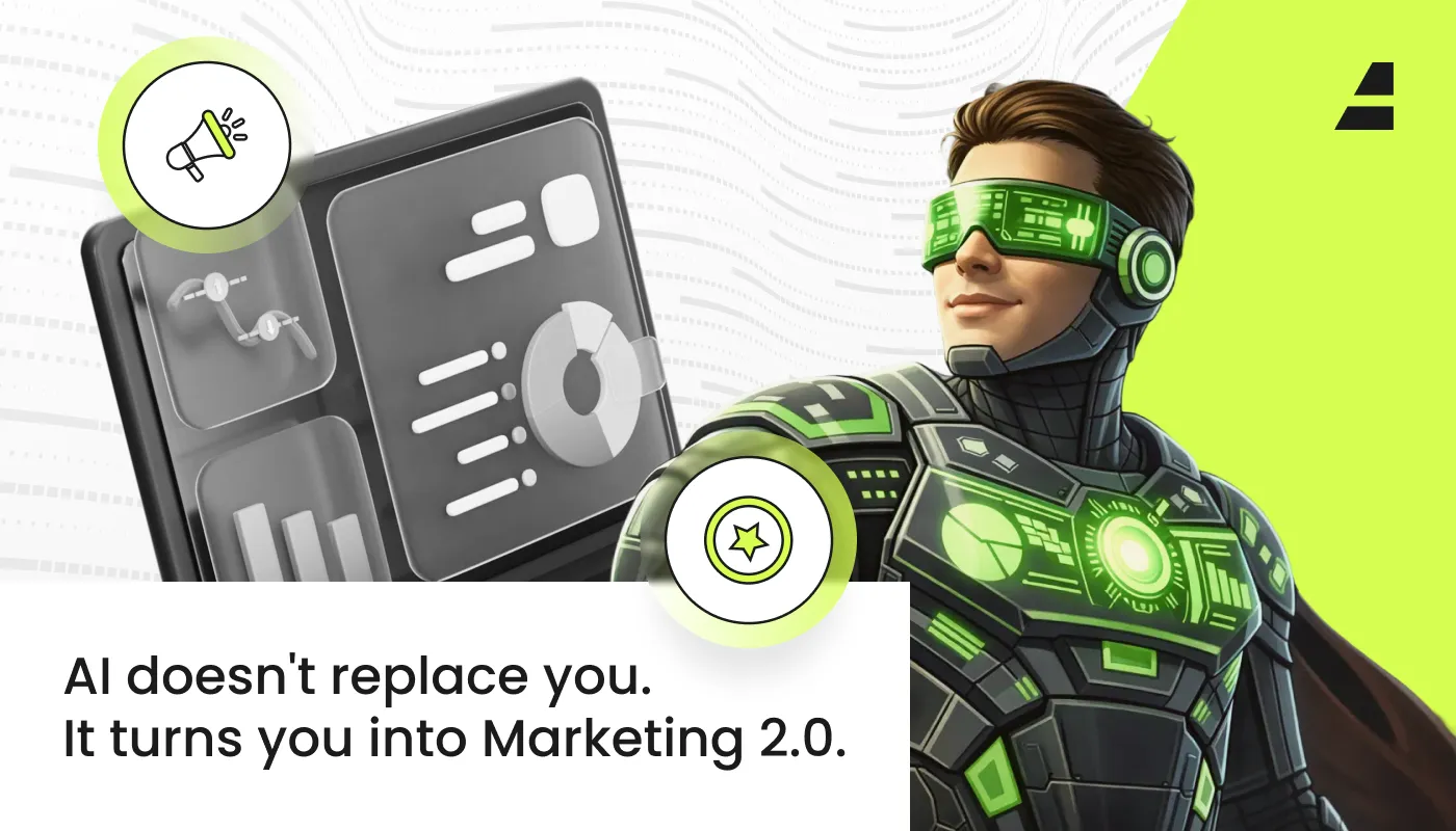 AI doesn't replace you; it turns you into Marketing 2.0. A visual metaphor for the synergy between human strategy and technological augmentation.