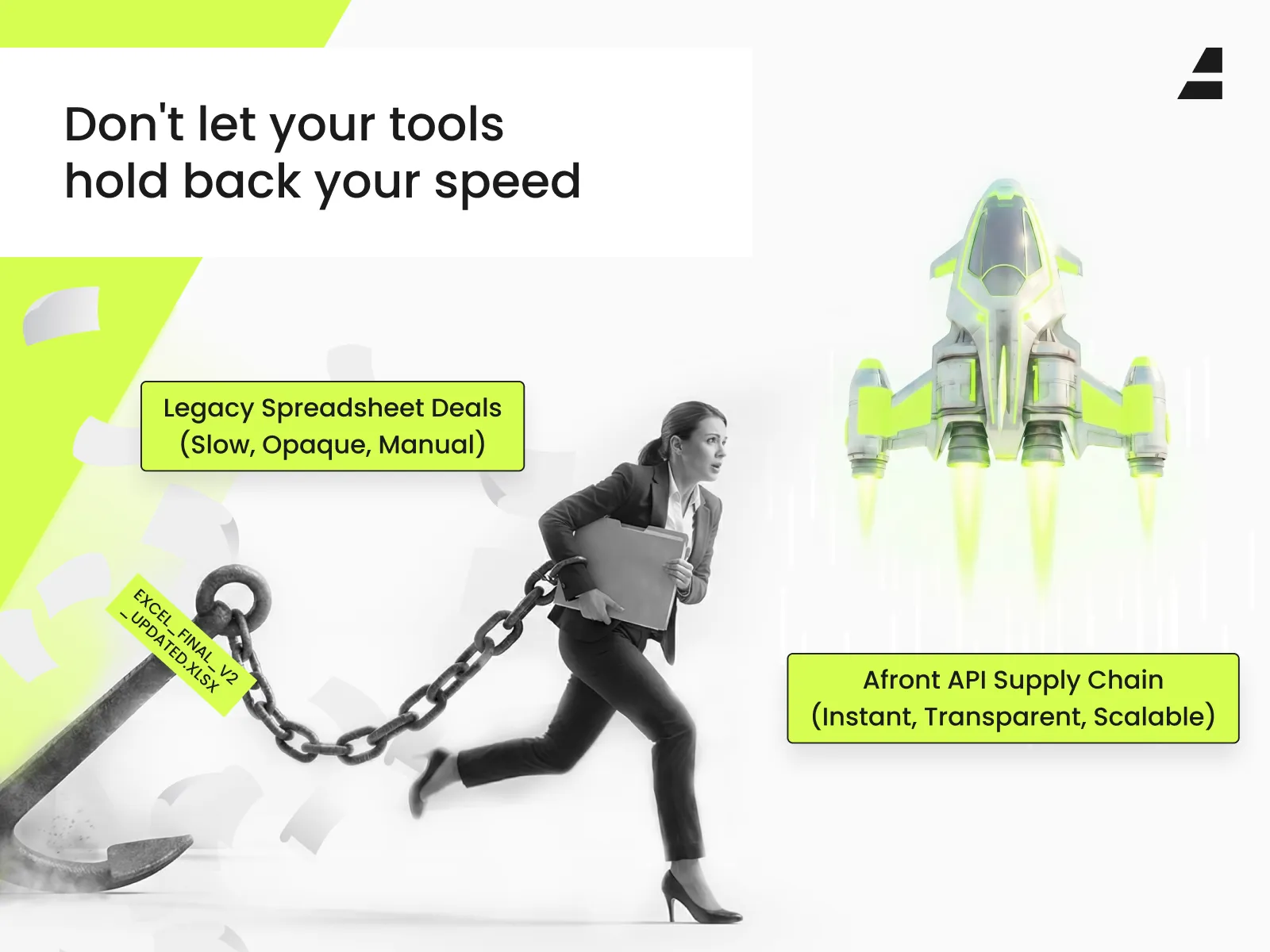 Efficiency comparison between slow manual spreadsheet deals and the instant, transparent Afront API supply chain.